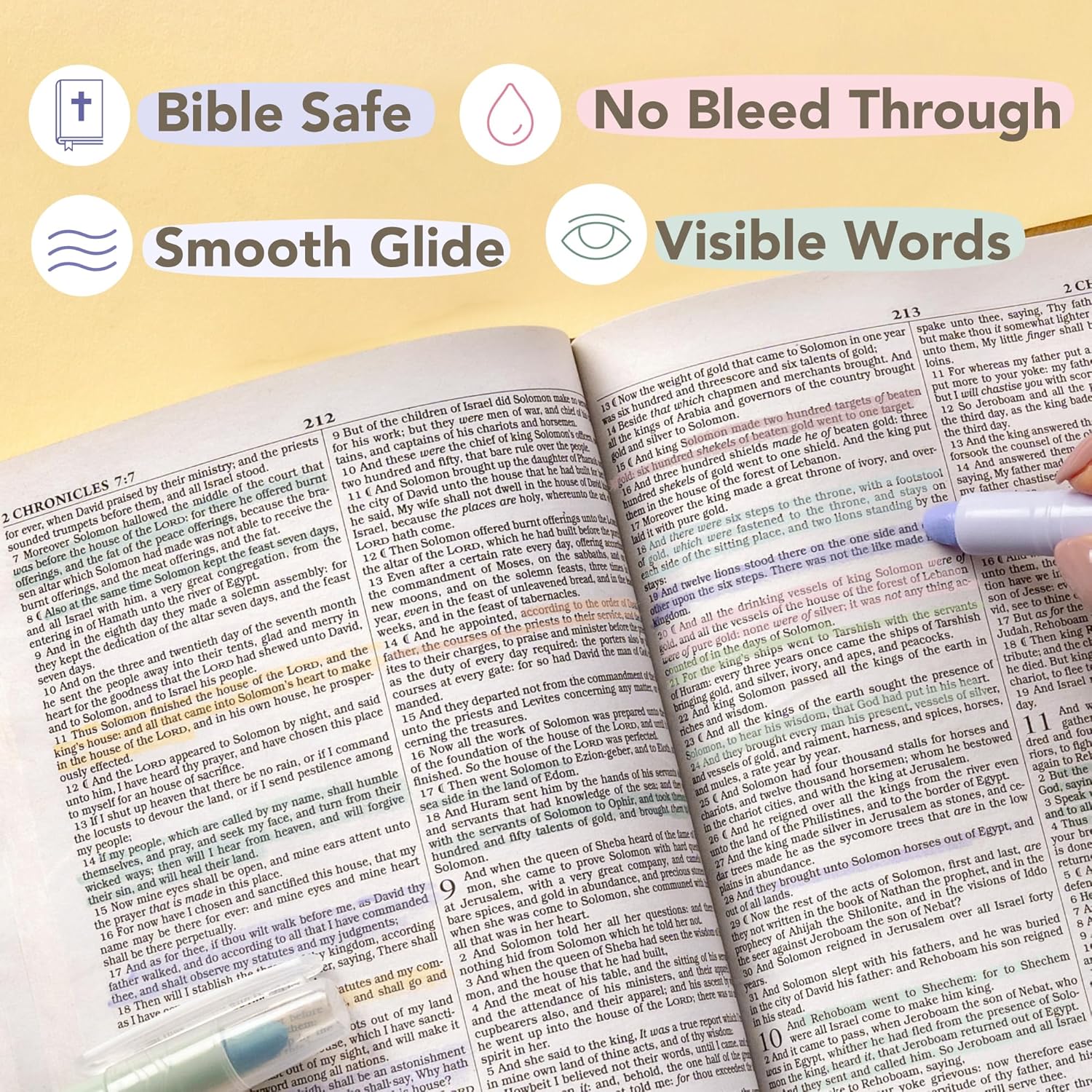 Estos marcadores de gel para la Biblia utilizan una fórmula de cera suave que se desliza suavemente sin traspasar las páginas finas, proporcionando marcas limpias y resistentes a las manchas, ideales para el estudio de las Escrituras, la redacción de diarios y la toma de notas. Disponibles en dos paquetes de 10 unidades (colores vivos o pastel), son duraderos, suaves con el papel delicado y ligeros para facilitar su uso en casa, en la iglesia o durante los desplazamientos.