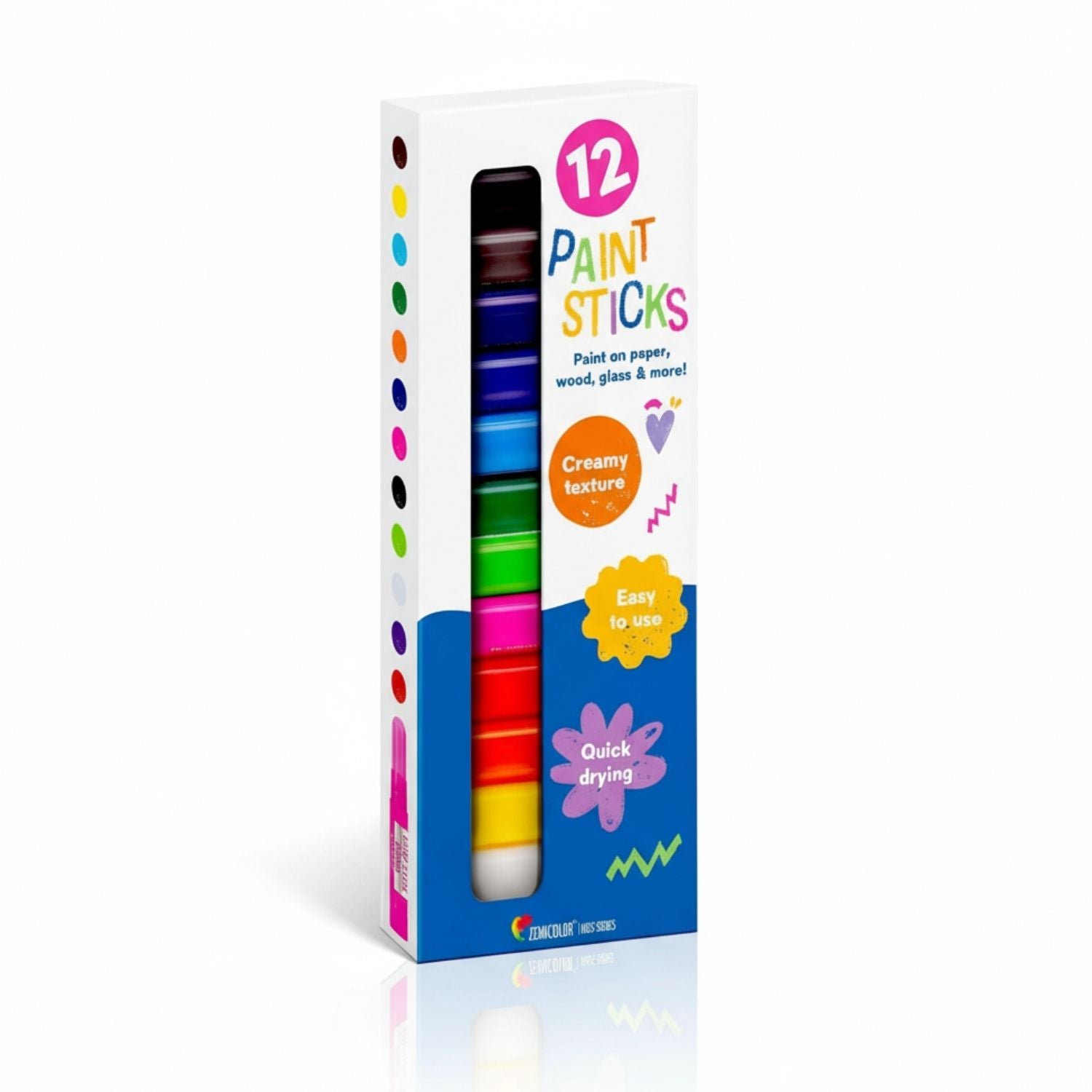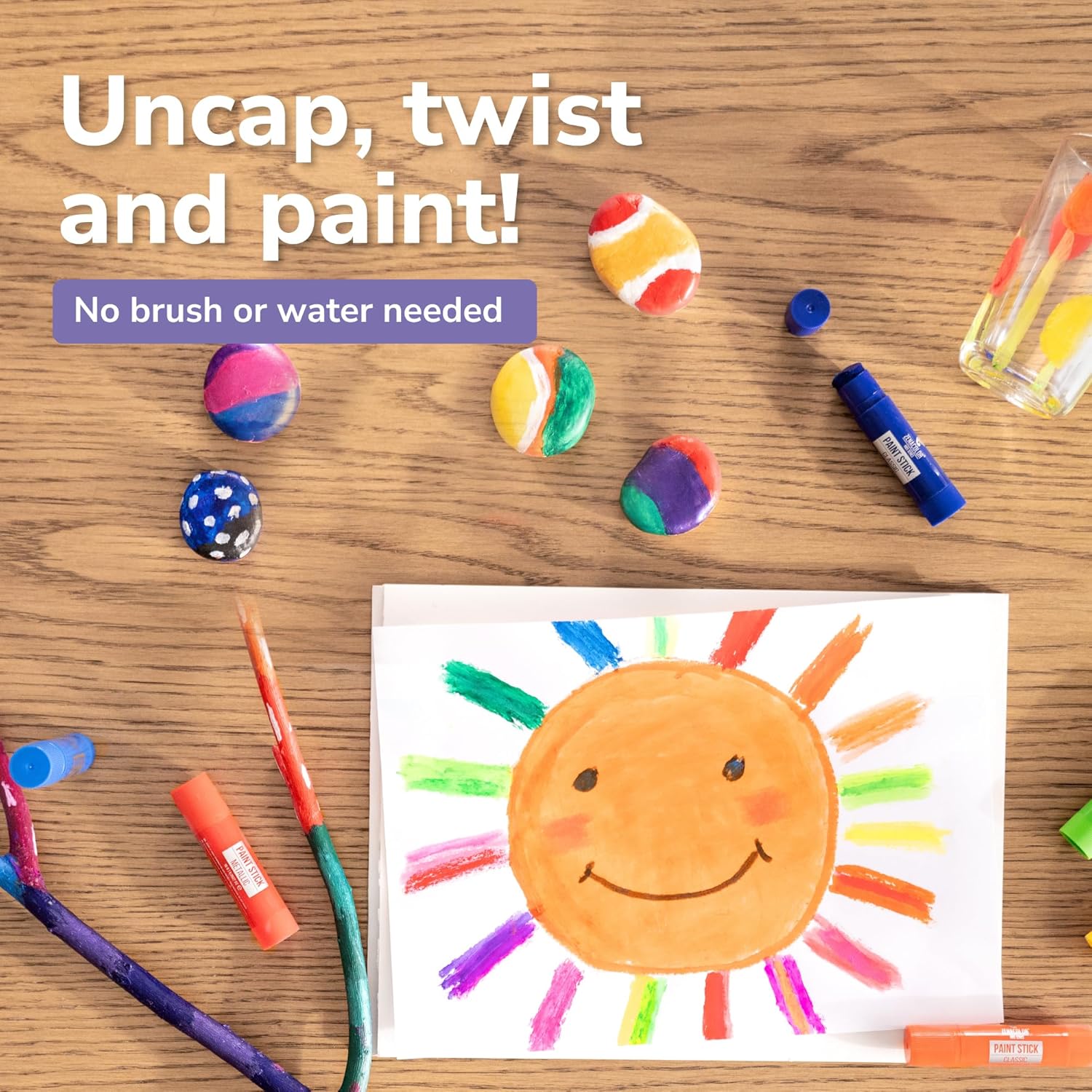 Este paquete de 12 barras de pintura cremosas y giratorias ofrece a los niños colores vivos y mezclables que se secan en unos 90 segundos, sin manchas, sin pinceles y sin necesidad de agua. Se pueden lavar con agua y jabón, son seguras y no tóxicas, y se pueden utilizar en papel, carteles, ventanas, piedras, madera y mucho más, lo que hace que el arte creativo y sin ensuciar sea fácil y divertido.